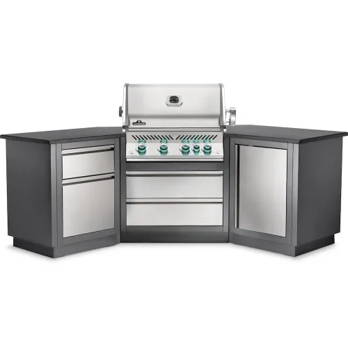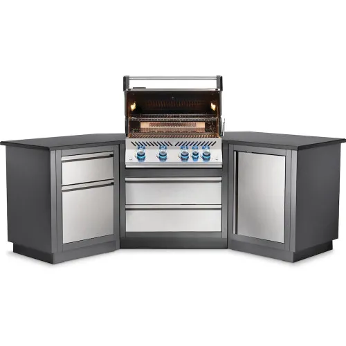 Дана конфігурація кухні на відкритому повітрі з вбудованим грилем Oasis 200 ідеально підходить як окрема кутова зона барбекю. Завдяки вигнутій формі модульна кухня Oasis 200 з вбудованим грилем Napoleon, може розміщуватися на маленьких та середніх площах. За допомогою широкого асортименту модульних елементів Oasis, Ви зможете сконструювати ідеальну зону гриль, яка буде відповідати всім Вашим вимогам. Модульні елементи стійкі до будь-яких погодних умов, оскільки виготовлені з оцинкованої сталі з порошковим покриттям та дверима з нержавіючої сталі. Проста установка, ніжки, що регулюються, по висоті. Вдосконалюйте свою літню терасу з відкритою кухнею Oasis 200 із вбудованим грилем Napoleon.