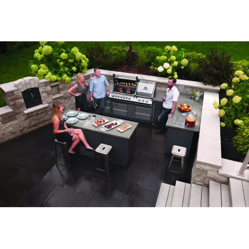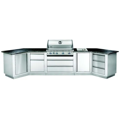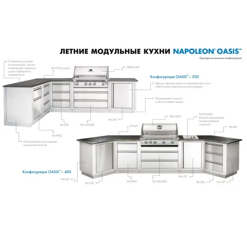 Звертаємо Вашу увагу! Стільниця не входить в комплектацію кухонь Napoleon Oasis і замовляється власником кухні самостійно згідно з особистими перевагами кольору, індивідуальним дизайном і розміром літньої кухні. Оптимальним моментом для замовлення стільниці є остаточна конфігурація літньої кухні у зібраному вигляді. Більшість виробників стільниць готові виїхати і зробити виміри після остаточного складання всіх тумб, щоб забезпечити ідеальне припасування.Літня кухня Napoleon Oasis-400 з грилем BILEX 605 складається з: