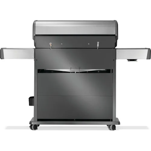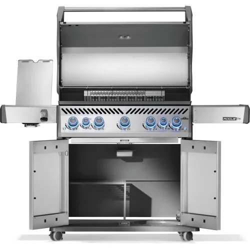 Napoleon Rogue PRO-S 625 оснащен вместительными боковыми столиками для принадлежностей для гриля, специй и аксессуаров. Правая полка складывается для экономии места, когда гриль не используется. Прочный нижний шкаф с дверцей оснащен держателем для газового баллона весом до 11 кг. Благодаря встроенным роликам гриль легко перемещать и использовать по своему усмотрению — идеально подходит для патио или сада.
