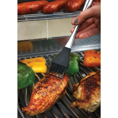 Щетка для гриля PRO длиной около 34 см из нержавеющей стали обеспечивает сочное наслаждение от гриля благодаря прочным силиконовым щетинам.