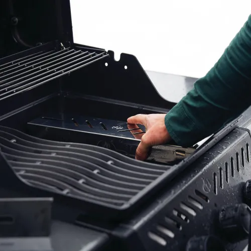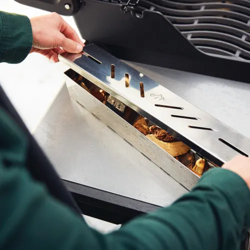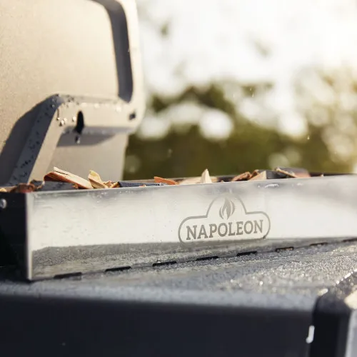 Контейнер для копчения Napoleon предназначен для использования в газовых грилях непосредственно в системе распределения тепла. Просто извлеките одну пластину-испаритель и на ее место поместите контейнер с заранее приготовленной влажной щепой. Наслаждайтесь ароматом древесного дыма, готовя на газовом гриле.
