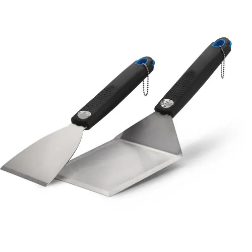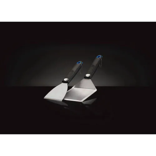 Набор для приготовления на планче состоит из двух практичных инструментов. И любители, и профессионалы предпочитают купить аксессуары для гриля именно этой модели. Большая лопатка даёт возможность комфортно переворачивать продукты в момент термической обработки, а с помощью скребка вы легко счистите остатки пищи и жира с металлической поверхности. Эти атрибуты обладают следующими преимуществами: