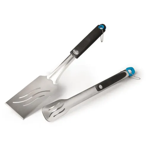 Набор состоит из двух самых важных аксессуаров для гриля: лопатки и щипцов для переворачивания продуктов. Приборы подходят как для мелких, так и для более крупных продуктов. Лопатка оснащена зубчатым краем и лезвием, поэтому с ее помощью можно легко измельчить овощи и приготовить овощную сковородку или просто нарезать блюда с гриля. Также лопатка идеально подходит для гамбургеров и жареного сыра. С помощью щипцов легко переворачивать стейки и любые средние по величине продукты. Щипцы оснащены замком-фиксатором, который хорошо держит прибор в закрытом состоянии. Оба прибора для барбекю изготовлены из нержавеющей стали, ручки оснащены мягкой накладкой и кольцом для подвешивания.