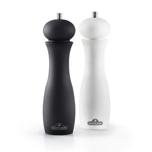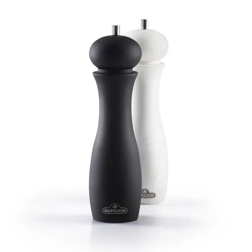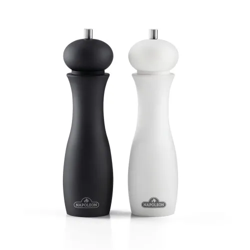 Набор от Наполеона состоит из мельницы для соли и мельницы для перца. Матовая мягкая поверхность мельниц имеет современный дизайн и хорошо лежит в руке. Регулируемое керамическое устройство помола подходит для измельчения мелкой и крупной соли и перца. Высокое качество изготовления мельниц для приправ рассчитано на долгие годы использования.