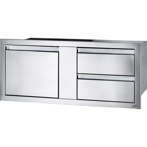 Этот встраиваемый шкаф состоит из одного вместительного отсека с дверью, одного малого и одного большого выдвижных ящиков. Модуль изготовлен из нержавеющей стали, что гарантирует долговечность и стойкость к коррозии. Дверь и выдвижные ящики оснащены доводчиками для мягкого закрытия. Удобные ручки изготовлены из анодированного алюминия, что препятствует быстрому износу. Бесшовная технология обеспечивает безупречную универсальную конструкцию с многочисленными вариантами монтажа. Идеально подходит для хранения посуды, аксессуаров для барбекю, специй и других кухонных принадлежностей.