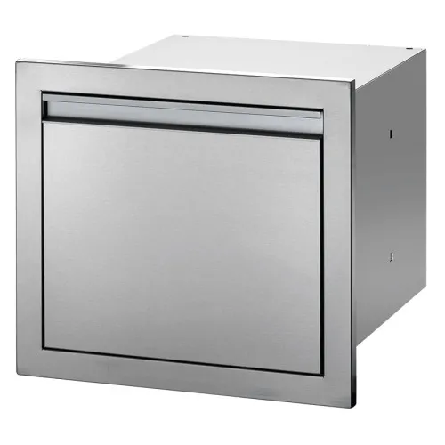 Этот стильный встраиваемый элемент состоит из одного достаточно вместительного выдвижного ящика, который изготовлен из нержавеющей стали и оснащен доводчиками для мягкого закрытия. Удобная ручка ящика изготовлена из анодированного алюминия, что гарантирует долговечность и стойкость к царапинам. Идеально подходит для хранения аксессуаров для барбекю, специй и других принадлежностей на Вашей летней кухне.
